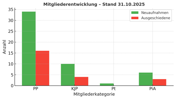 - PiA (Psychotherapeut*innen in Ausbildung): 6 Neuaufnahmen, 3 Austritte (weitergeführt als PP)